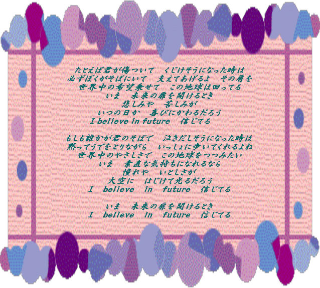 Believe ゆうすけの授業参観で聞かせてもらった曲です。 ひとりひとりの優しさは、やがておおきなおおきな輪になって この地球ををつつみ、 争いごとのない、平和な世界をもたらすことでしょう。
