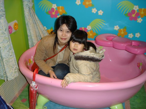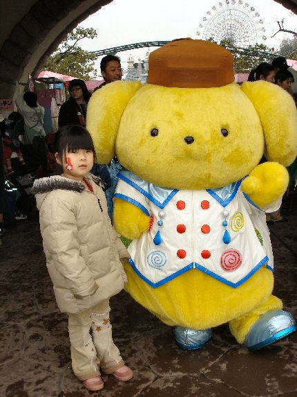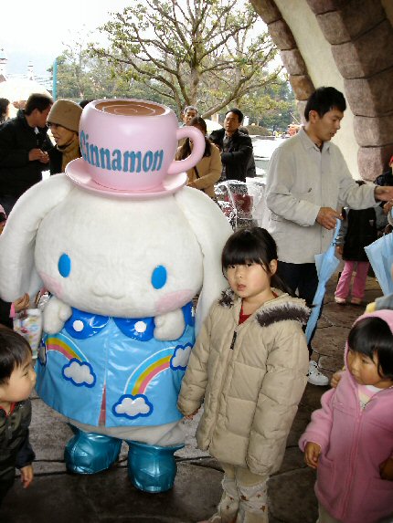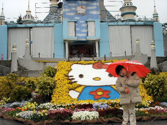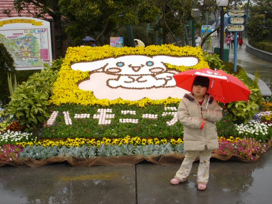 ![]() この日はあいにくの雨 楽しみにしていたパレードは 中止となってしまいましたが、 いくつかの乗物系が運休となった 以外、アトラクションは 通常通り、見学することが できました。後ろに写っているのは 「キティキャッスル」です。 |